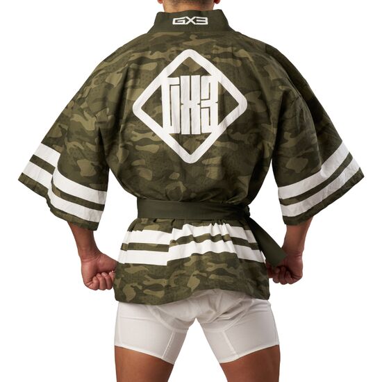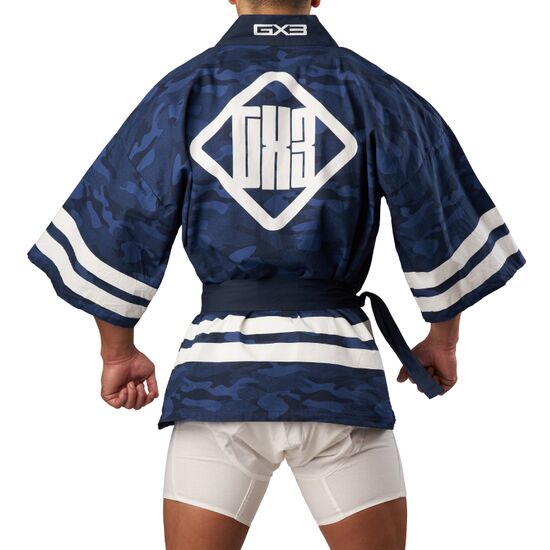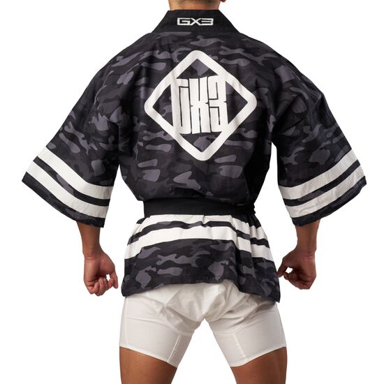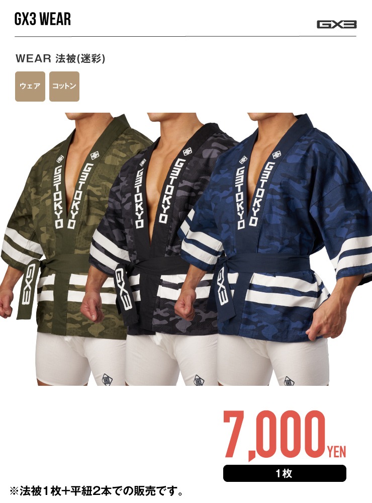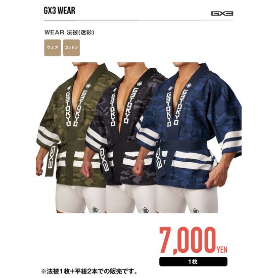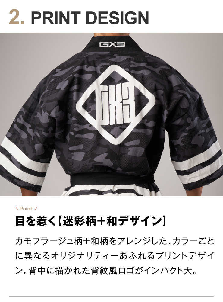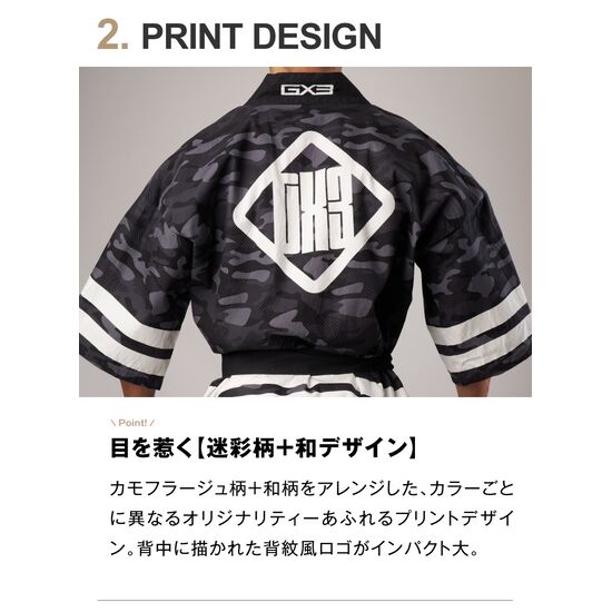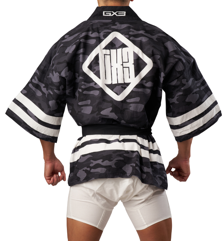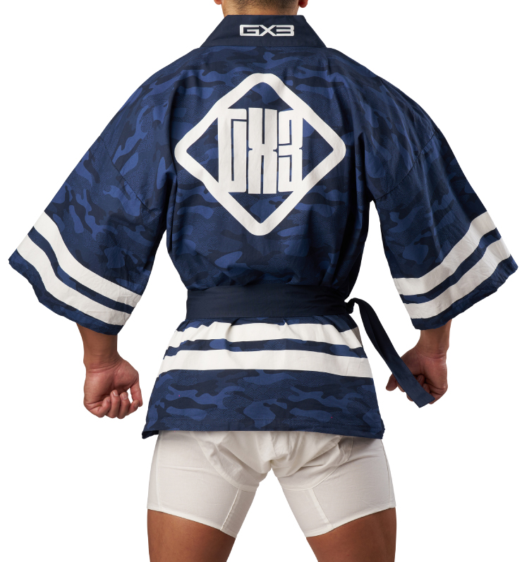 The back features a large, eye-catching print with the GX3 logo styled like a family crest, giving it a distinctive Japanese design.