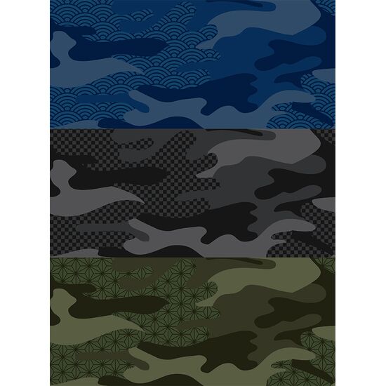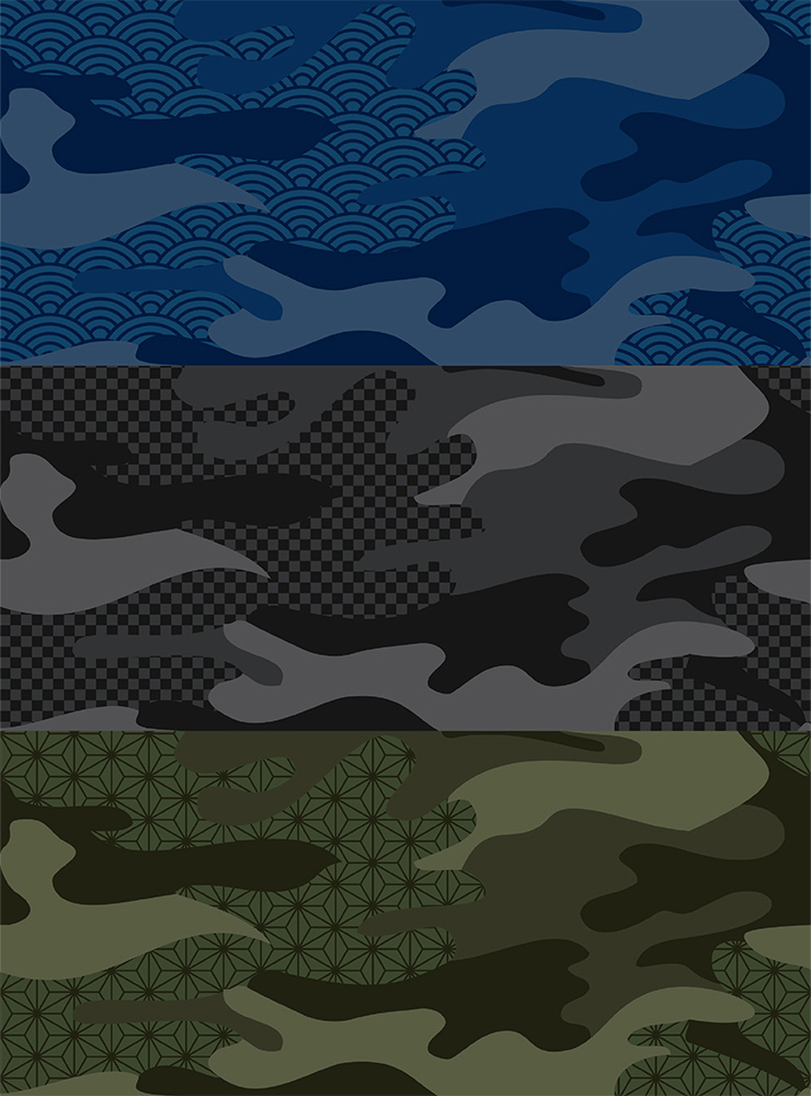 The entire fabric features an original print design that mixes camouflage with Japanese patterns.