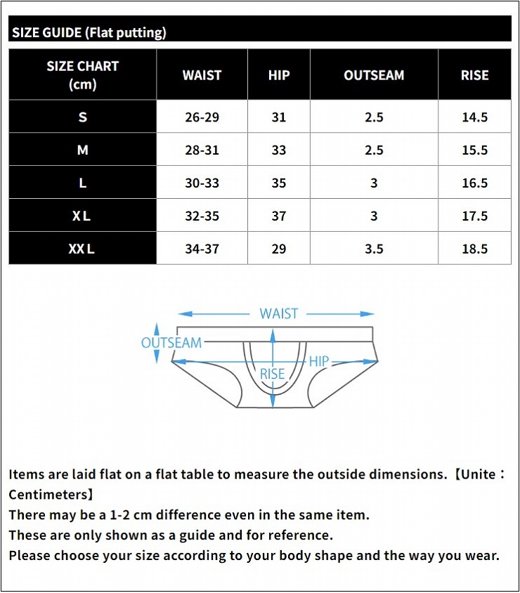 Waist size: Put flat underwear then measure waist elastic width.